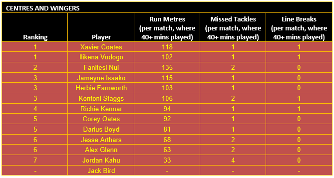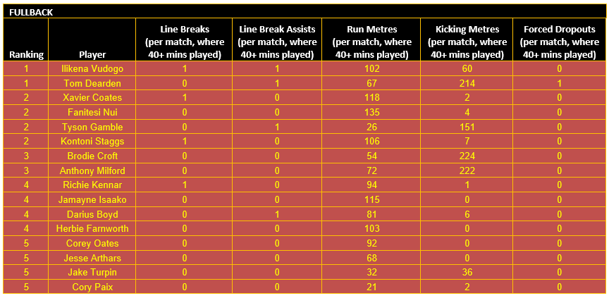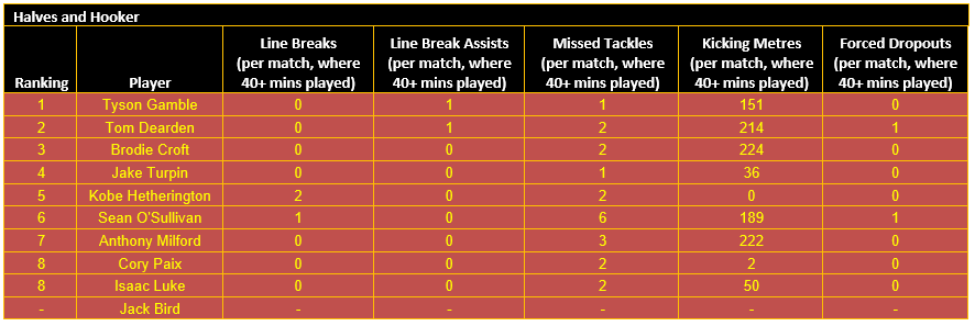 Once categorised, each player’s output in defined key performance indicators (KPIs) for their respective positional category is then considered, using data sourced from the NRL and QRL.