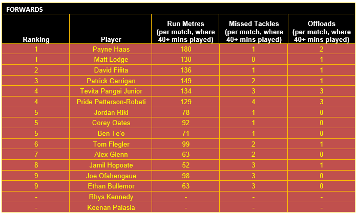 Following each round of the NRL Premiership and Intrust Super Cup, each contracted Broncos player’s season-to-date performance is analysed and ranked against their internal competition.