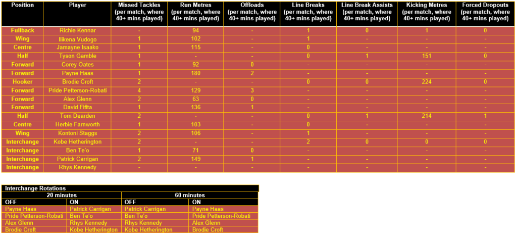 Based on the above analytical comparison, and with Palasia, Lodge, Flegler, Turpin, Milford, Bird, and Nui injured, and Riki, Ofahengaue and Pangai Jnr suspended, the 17 players which comprise the Broncos’ most productive team for their Round 17 clash versus the Gold Coast Titans would appear to be as follows (with the proposed interchange rotations also outlined below):