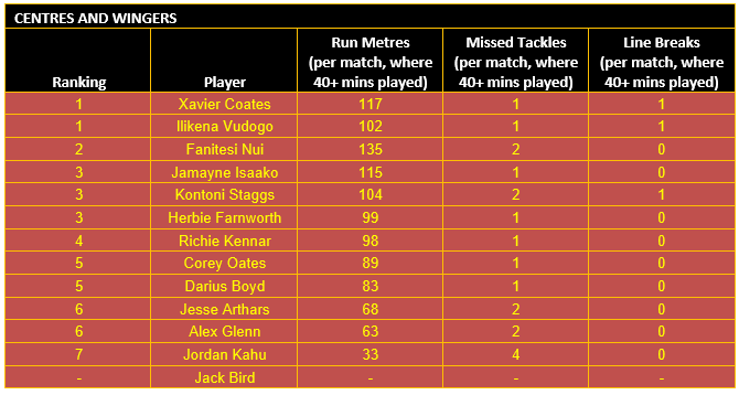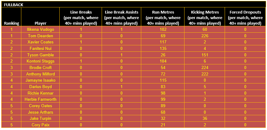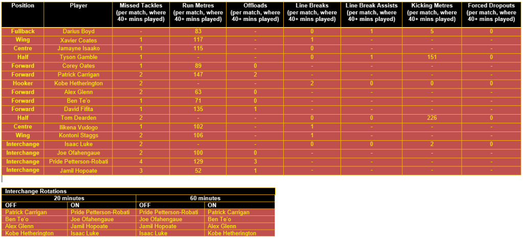 Once categorised, each player’s output in defined key performance indicators (KPIs) for their respective positional category is then considered, using data sourced from the NRL and QRL.