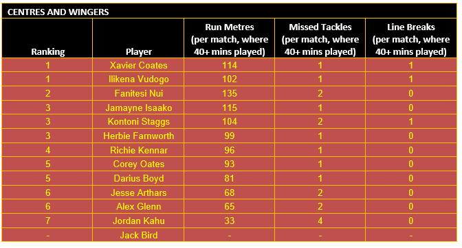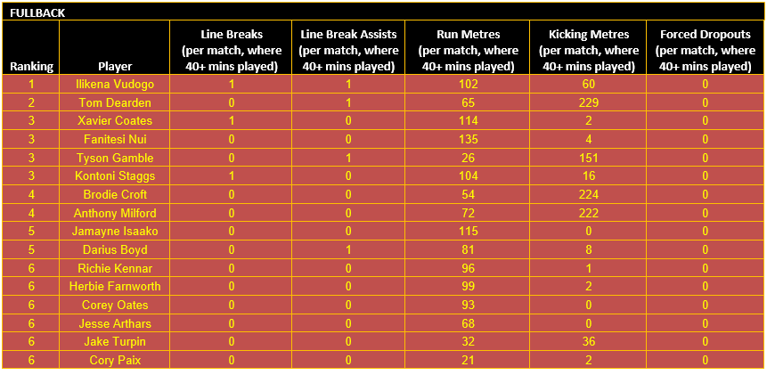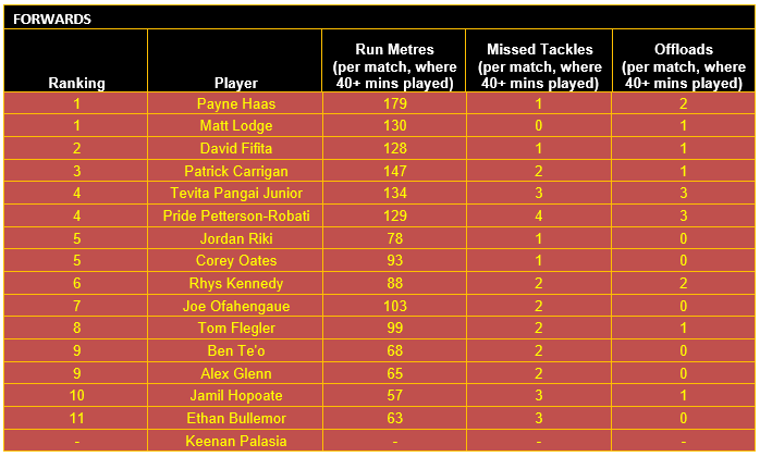 Once categorised, each player’s output in defined key performance indicators (KPIs) for their respective positional category is then considered, using data sourced from the NRL and QRL.