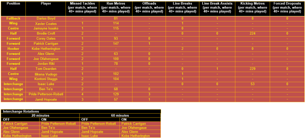 Based on the above analytical comparison, and with Palasia, Lodge, Flegler, Fifita, Gamble, Turpin, Milford, Bird, and Nui injured, and Kennedy and Pangai Jnr suspended, the 17 players which comprise the Broncos’ most productive team for their Round 20 clash versus the North Queensland Cowboys would appear to be as follows (with the proposed interchange rotations also outlined below):