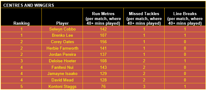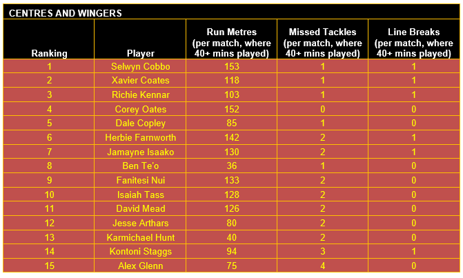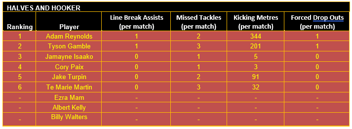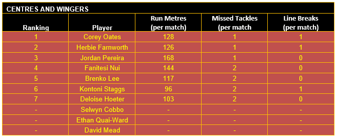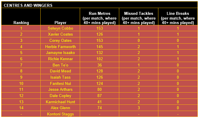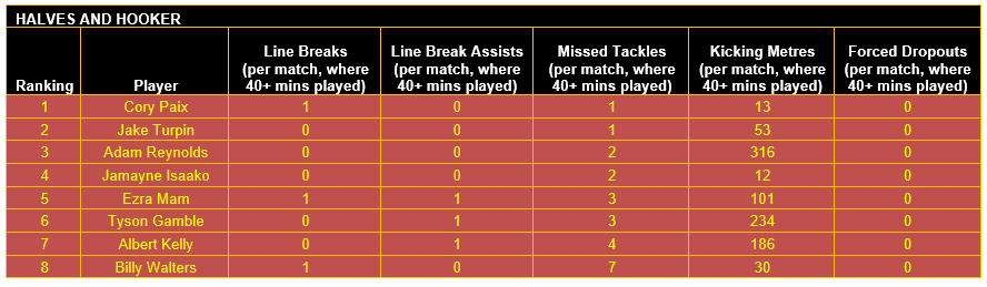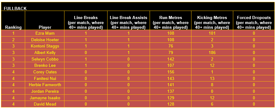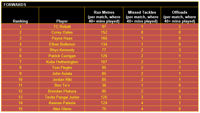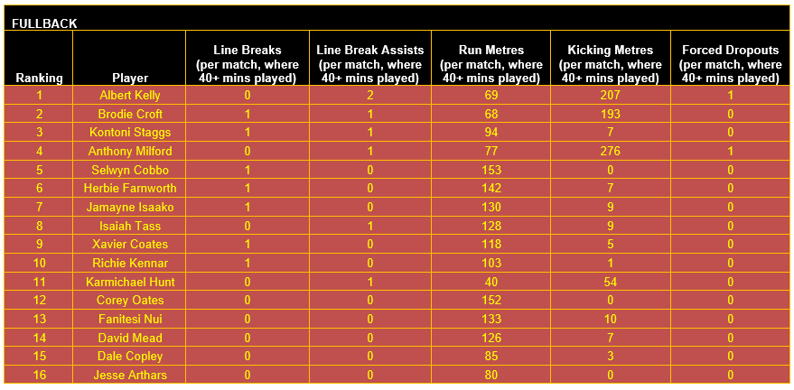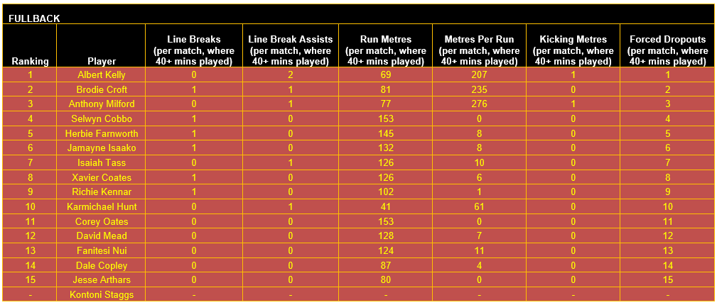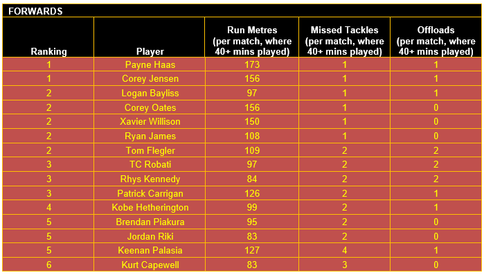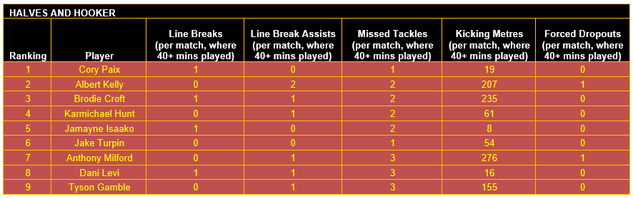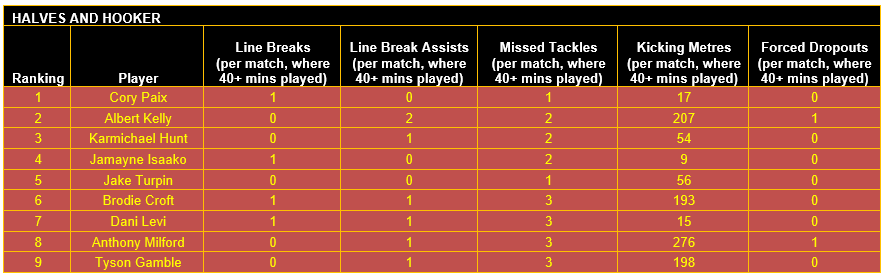 Once categorised, each player’s output in defined key performance indicators (KPIs) for their respective positional category has then been considered, using data sourced from the NRL and QRL.